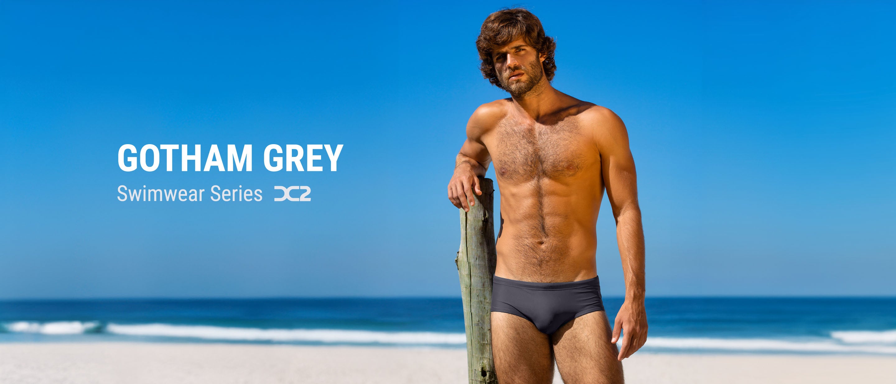 • DC2 GOTHAM GREY Swim Trunks — model wearing square-cut skin-hugging swim trunks in sleek grey with a subtle shine finish.
