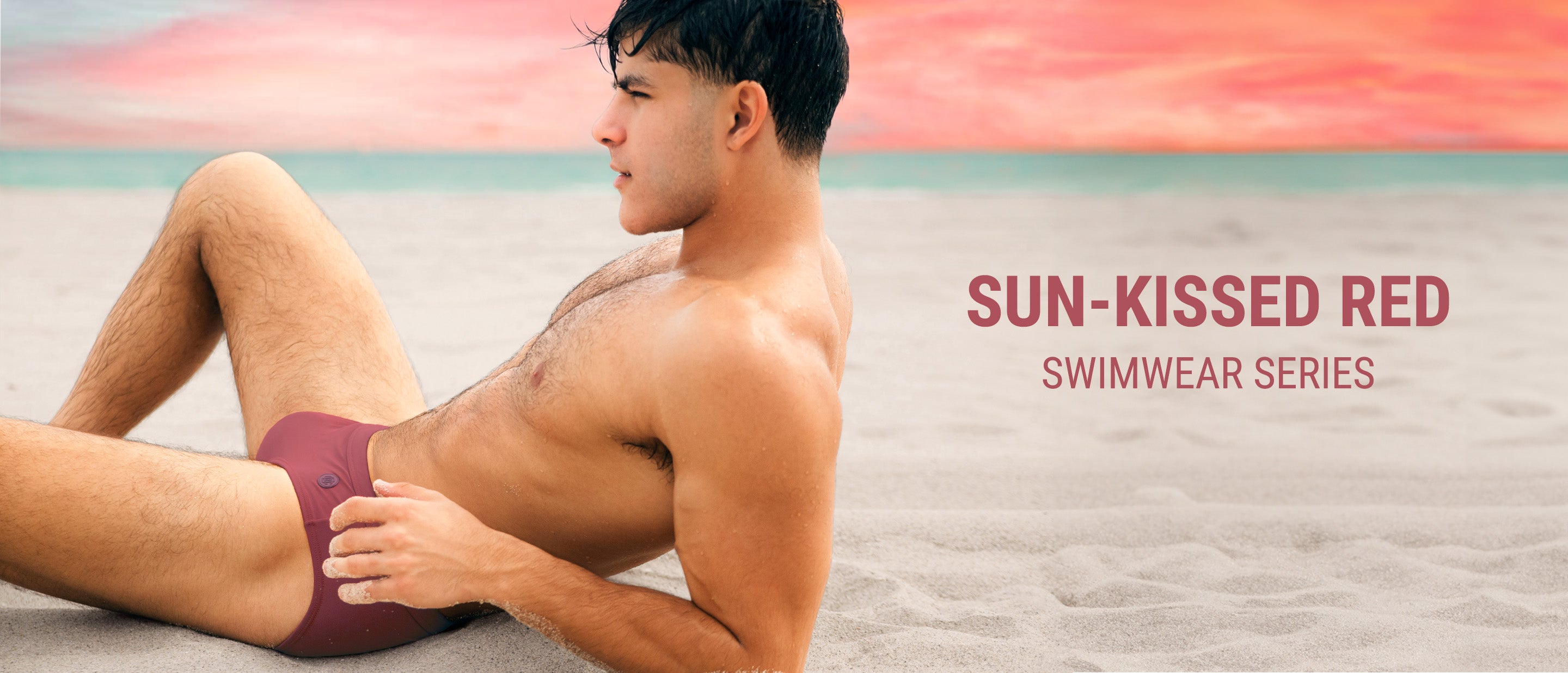 • Front view of model wearing the SUNKISSED RED men’s Swim Sunga in a solid dark red color by DC2, a men's beachwear brand from Miami.