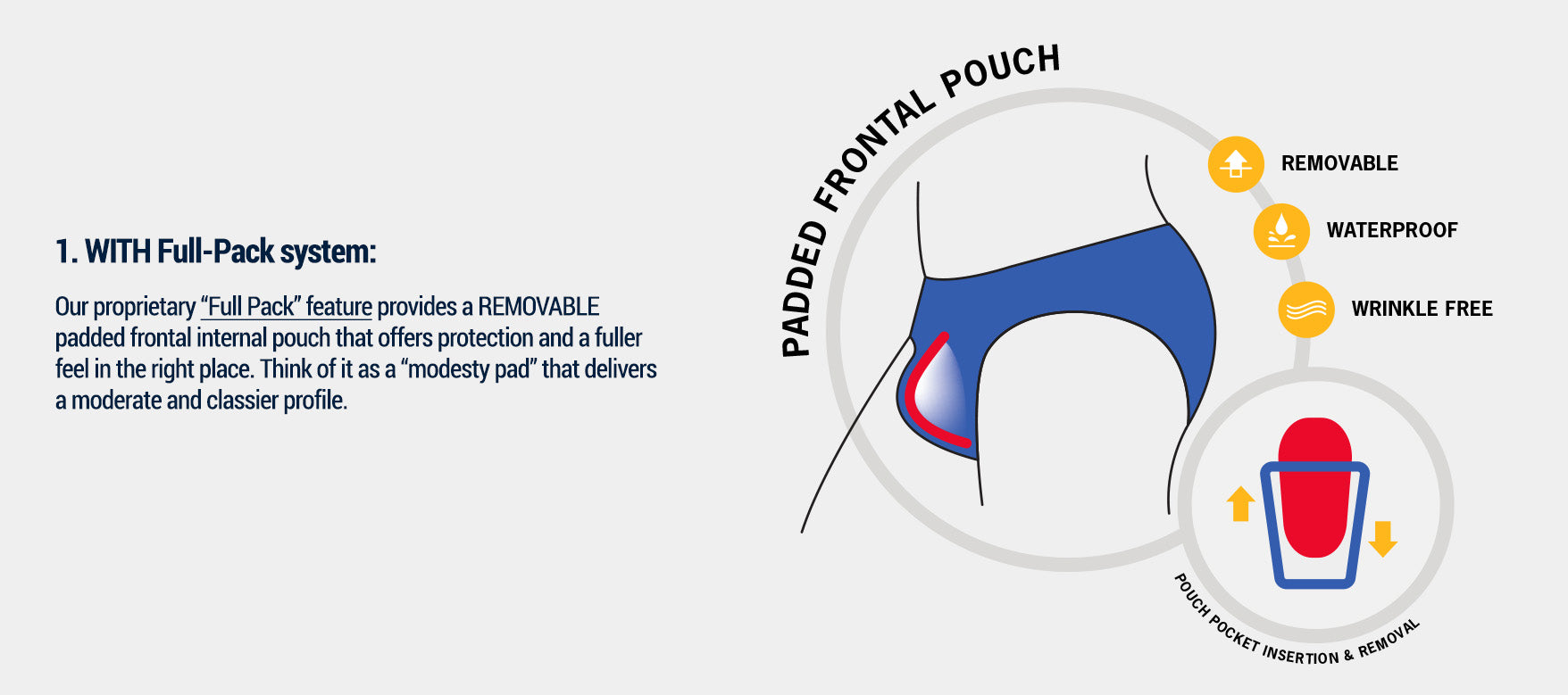 - The “Full Pack” system is included only in our Swim Briefs. It is not available with our Swim Mini-Briefs, our Swim Shorts, or any of our "beach shorts."