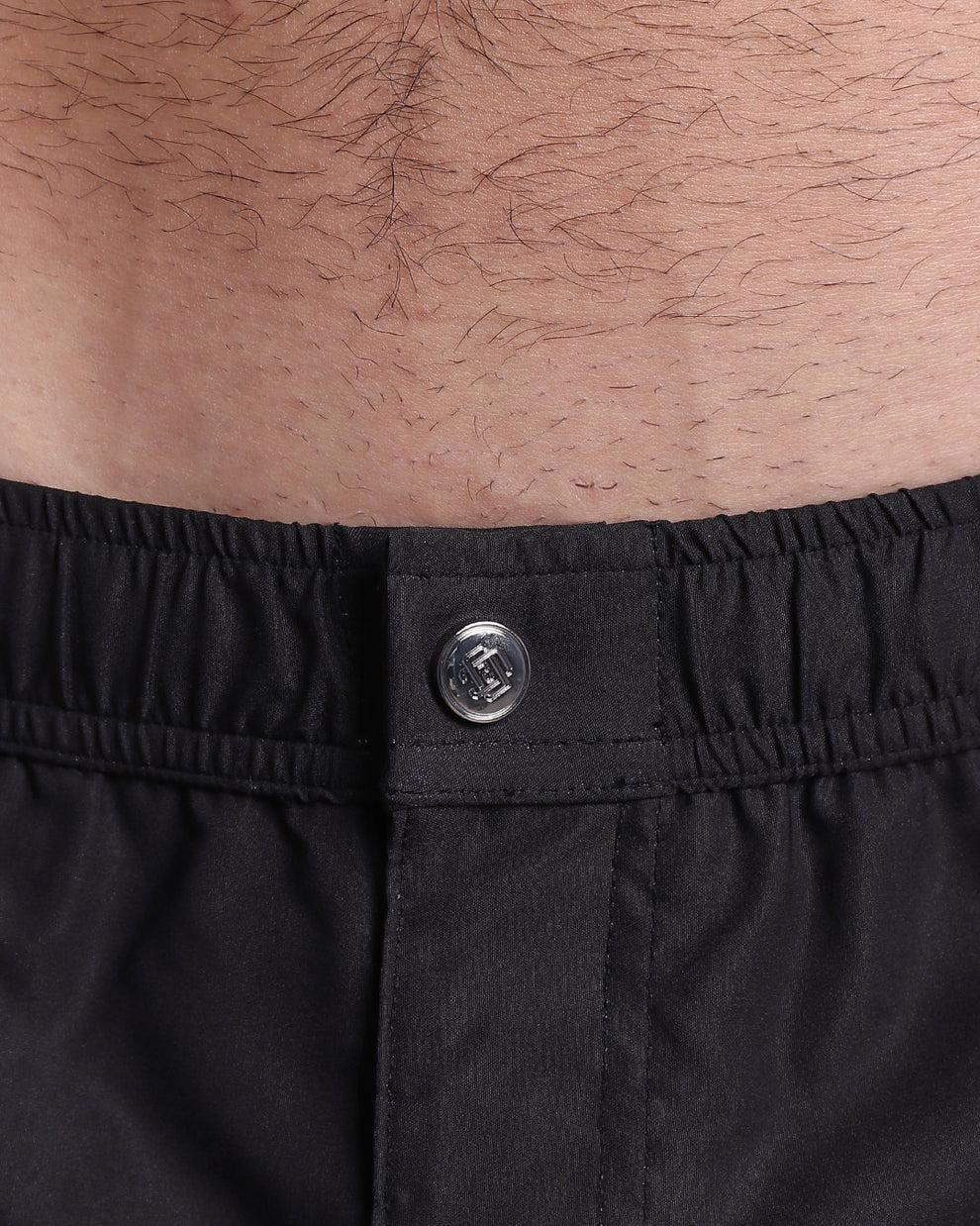 - Elastic waistband with custom logo snap-button, matching engraved eyelets, Velcro fly, and internal drawstring with signature engraved metallic tips